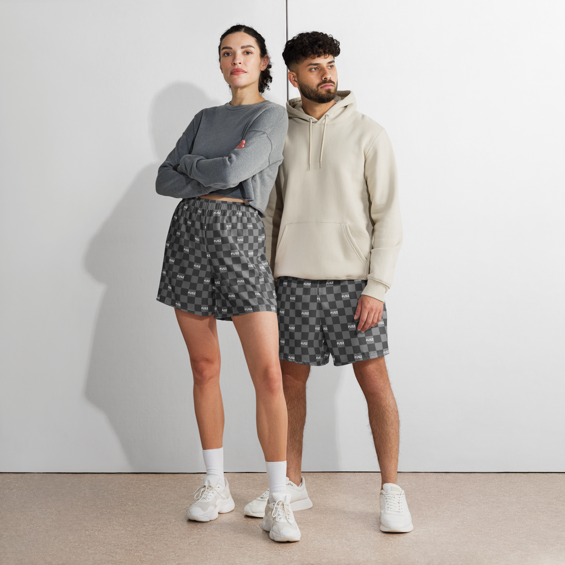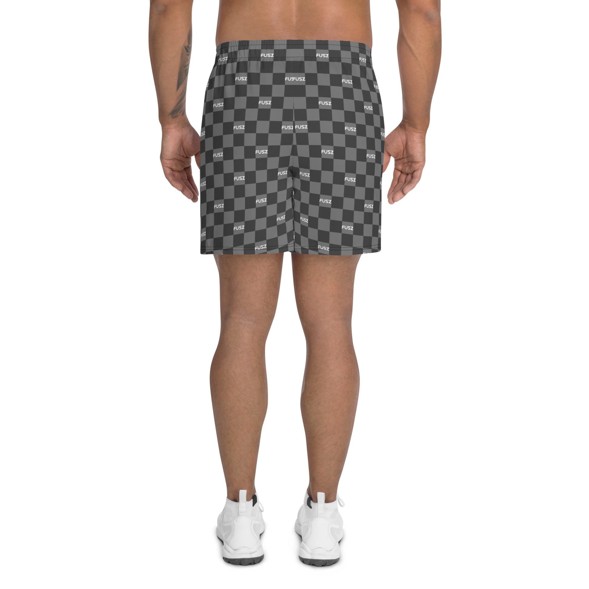 These men's recycled athletic shorts feature the all-over checkered Fusz gray pattern. These shorts are so comfy and made from such a versatile fabric that you won't feel out of place at any sports event. And, of course, they have pockets. Need we say more?
