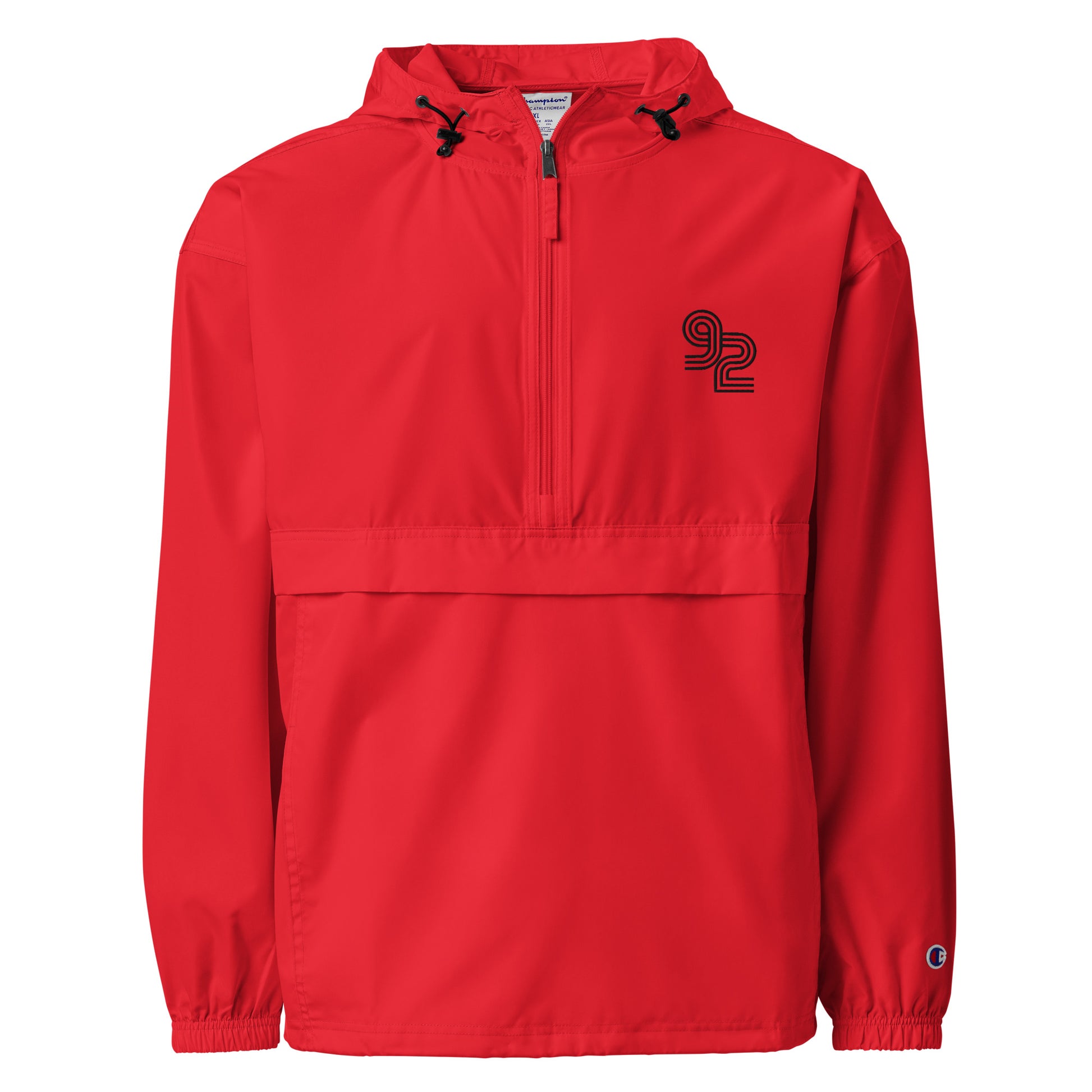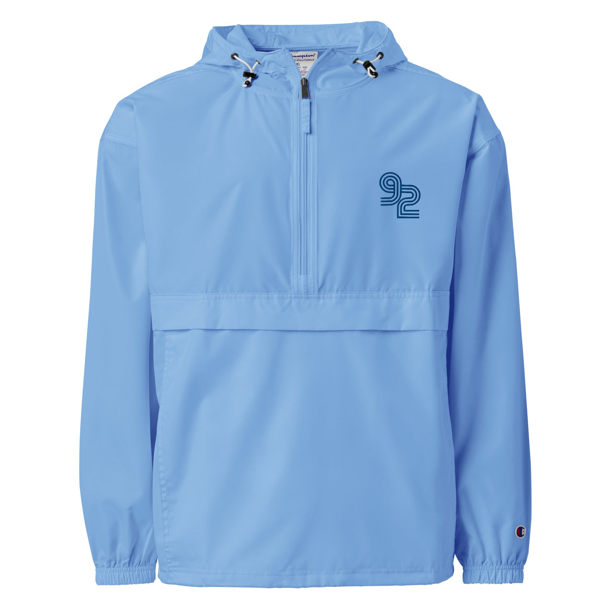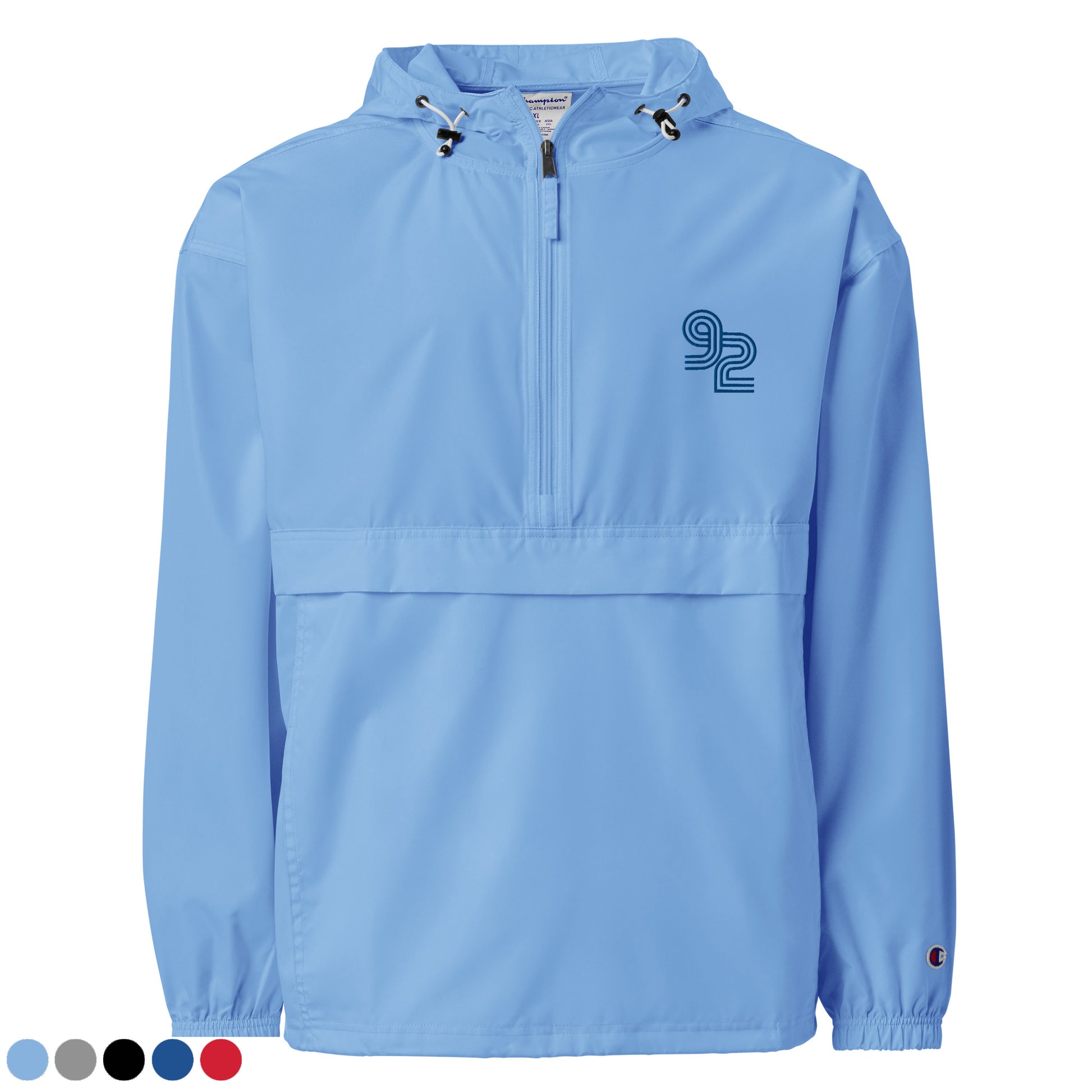 Select from a variety of colors in this adult unisex packable Champion jacket featuring the embroidered 92 logo. This wind and rain resistant polyester jacket has a practical hood, front kangaroo pocket and zipped pouch pocket which you can pull out and use to scrunch the jacket into for convenient storage.