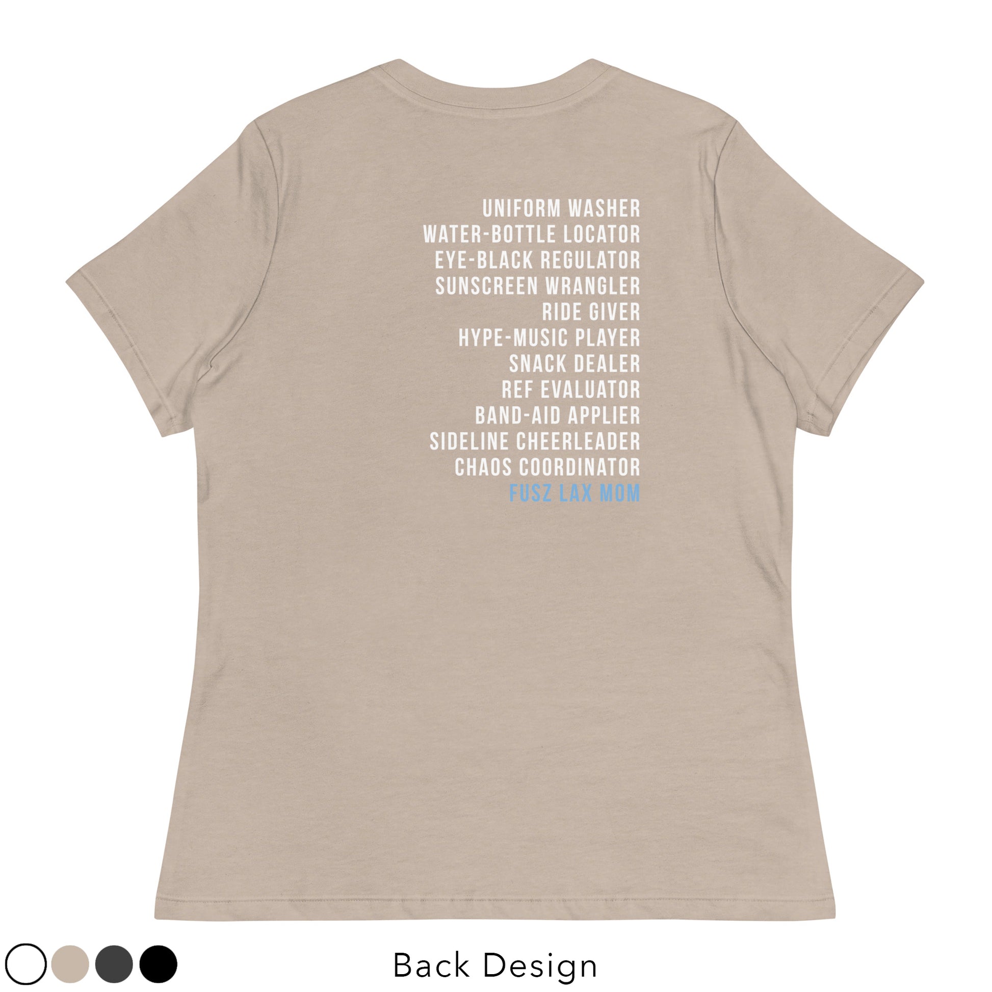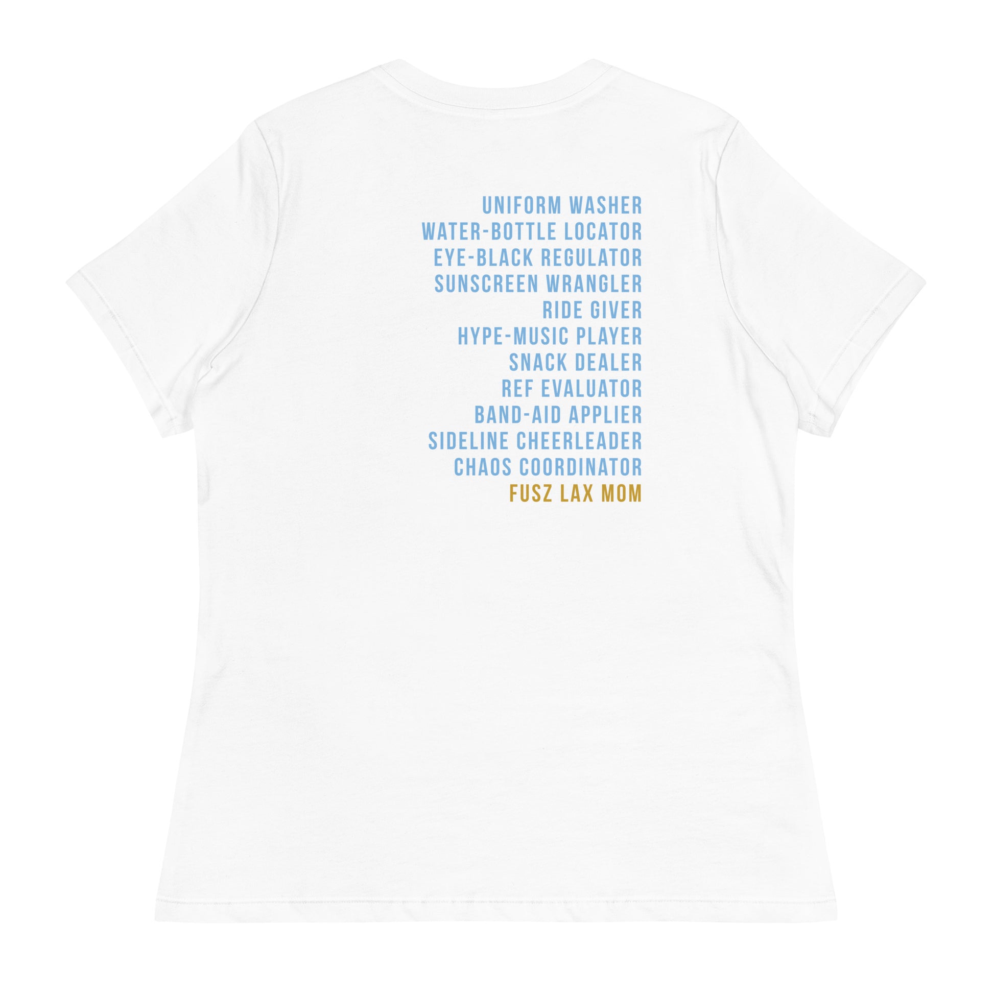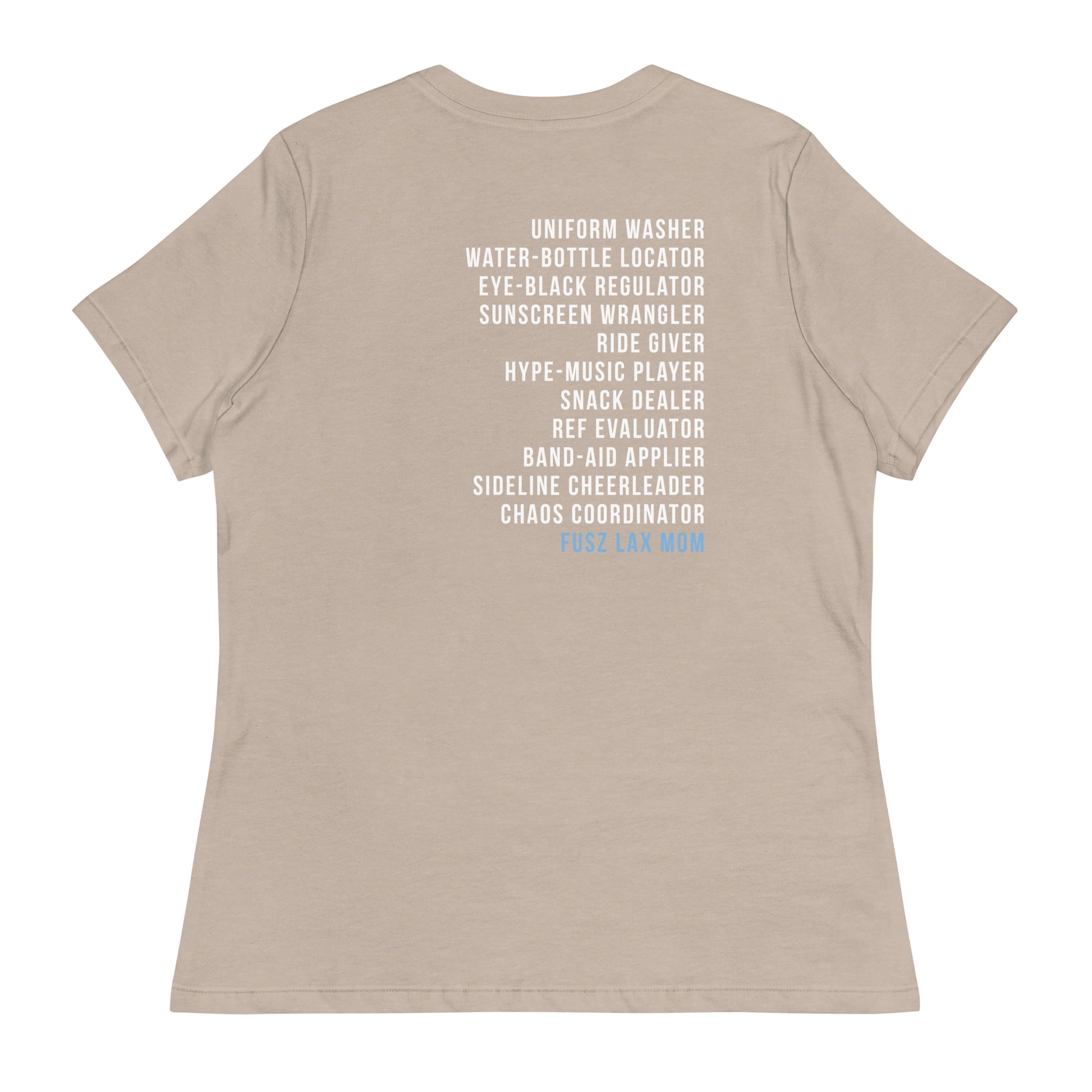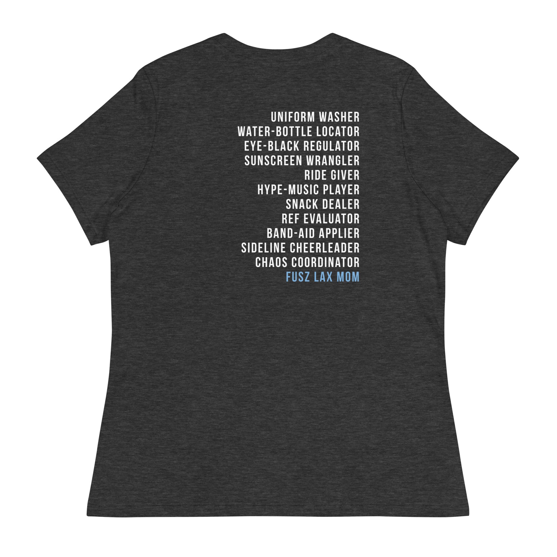 Select from a variety of colors with this women's shirt featuring the Fusz Athletic lacrosse logo printed small on the front and the lacrosse mom list on the back. This just might be the softest and most comfortable women's t-shirt you'll ever own.