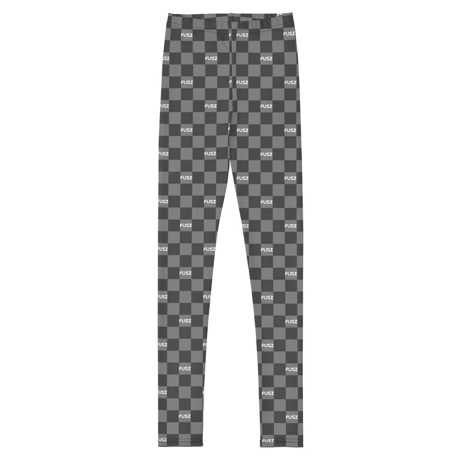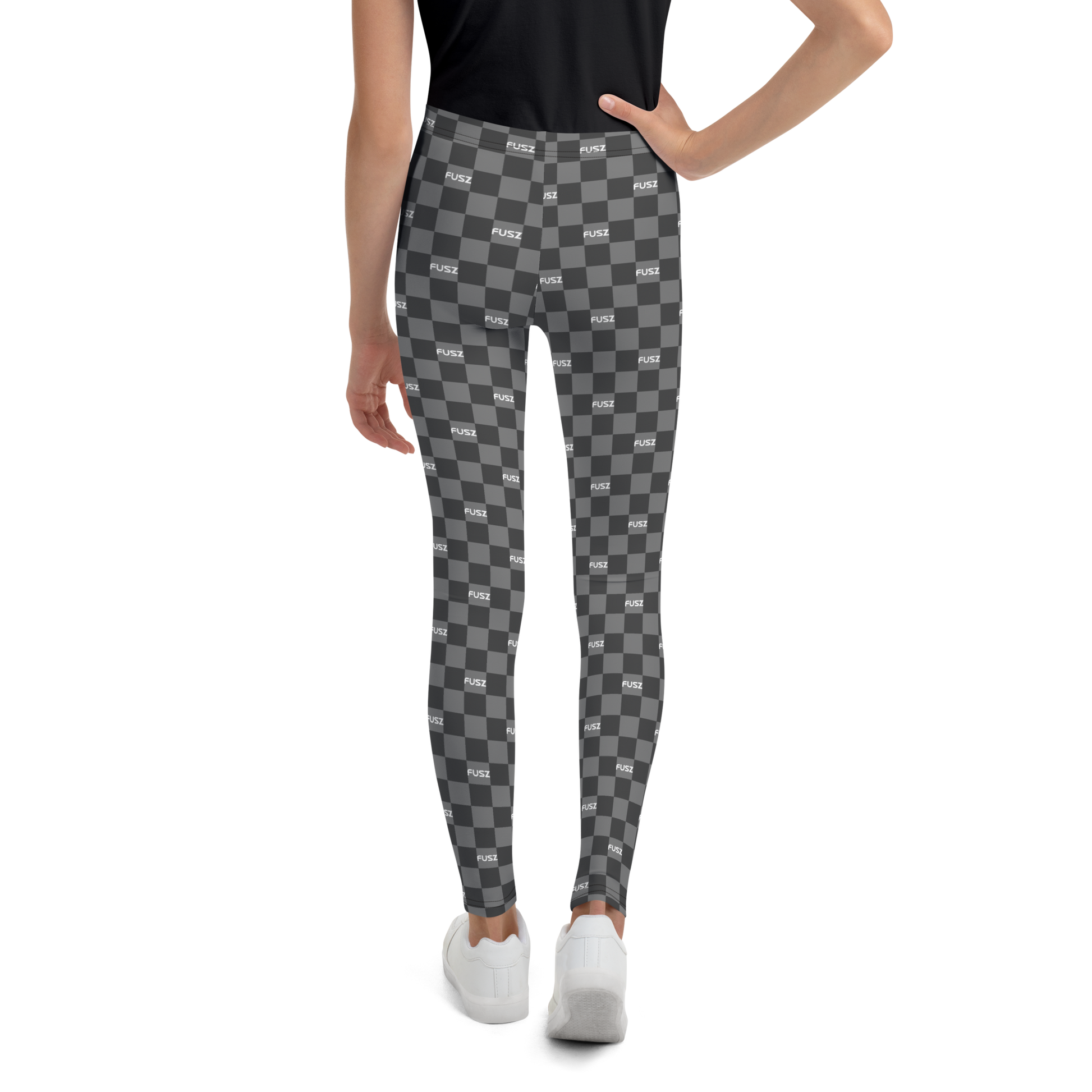 These youth leggings feature the all-over checkered Fusz gray pattern in a variety of sizes. These soft leggings with an elastic waistband are perfect for active kids who are always on the move. Need a smaller size? Check out our Kid's leggings with the same pattern.
